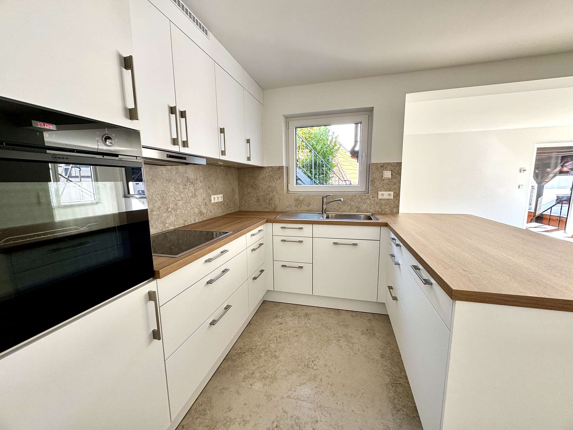 Der helle Wohnbereich ist offen gestaltet und umfasst die voll ausgestattete Einbauküche mit eleganter Theke, die sich harmonisch in den Raum einfügt. Hochwertige Geräte und ein durchdachtes Design bieten hier zeitgemäßen Komfort. Vom Wohnbereich aus gelangt man direkt auf die großzügige, überdachte Terrasse – ein vielseitig nutzbarer, geschützter Außenbereich, der den Wohnraum auf angenehme Weise erweitert.