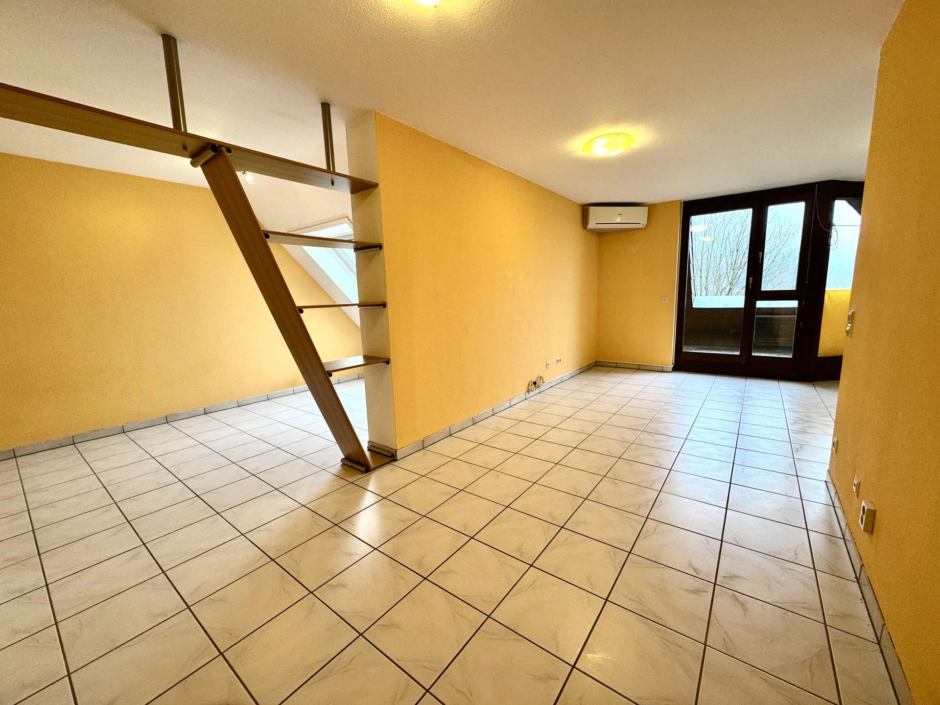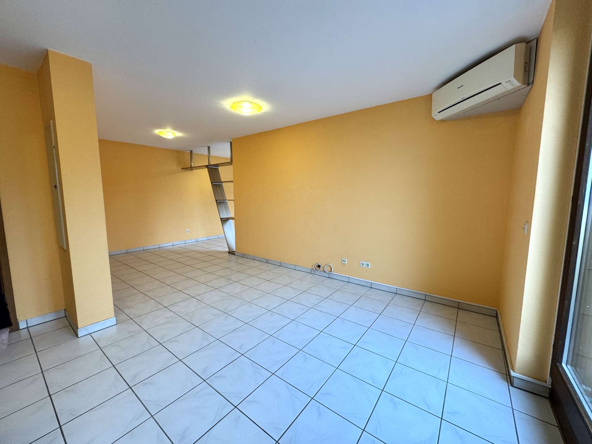 Der helle Wohnbereich wird durch einen abgetrennten Schlafbereich ergänzt, der für mehr Privatsphäre sorgt und eine ruhige Rückzugsmöglichkeit bietet – ideal für entspanntes Wohnen trotz kompakter Wohnfläche. Das Badezimmer ist mit einer Badewanne ausgestattet, die zu entspannten Momenten einlädt. Die Einbauküche bietet ausreichend Platz für die tägliche Nutzung. Für zusätzlichen Komfort sorgt eine Fußbodenheizung sowie eine Klimaanlage, die in der gesamten Wohnung ein angenehmes Raumklima schafft.